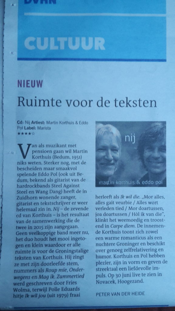 Nieuws / 5 juli 2017 CD Recensie Dagblad van het Noorden Een mooie recensie in het Dagblad van het Noorden.